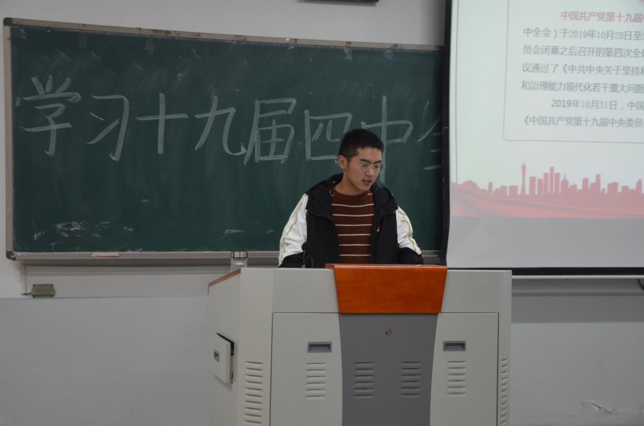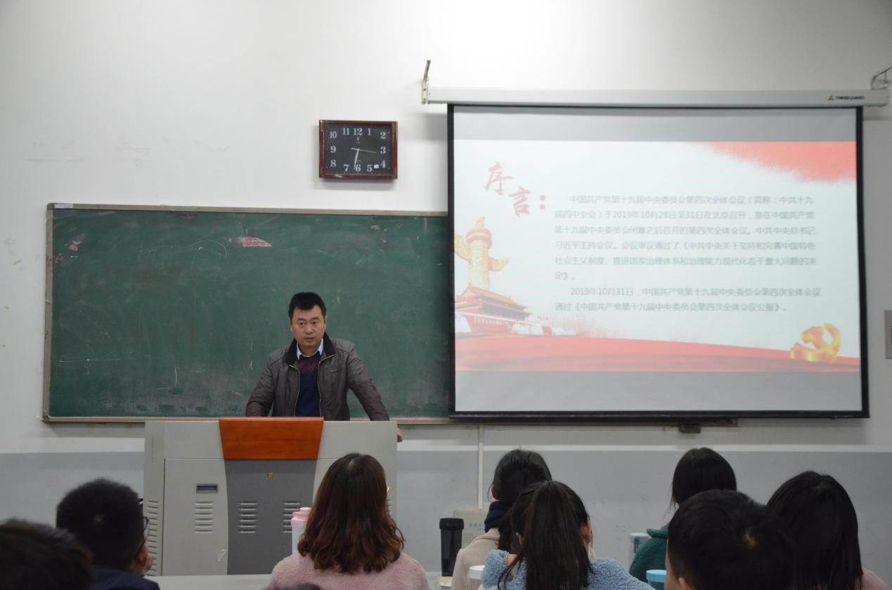 本网讯(审稿:李沛 供稿:张丹丹)为了深入贯彻学习党的十九届四中全会精神,加深各团支部对党的十九届四中全会科学内涵和精神实质的认识,11月18日,性爱网于龙子湖校区繁塔楼召开了以“聚焦十九届四中全会公报”为主题的十九届四中全会精神宣讲会。本次宣讲会由团委书记李沛、团委老师邓然、焦雪猛主讲。性爱网 各班团支部委员聆听了宣讲会。