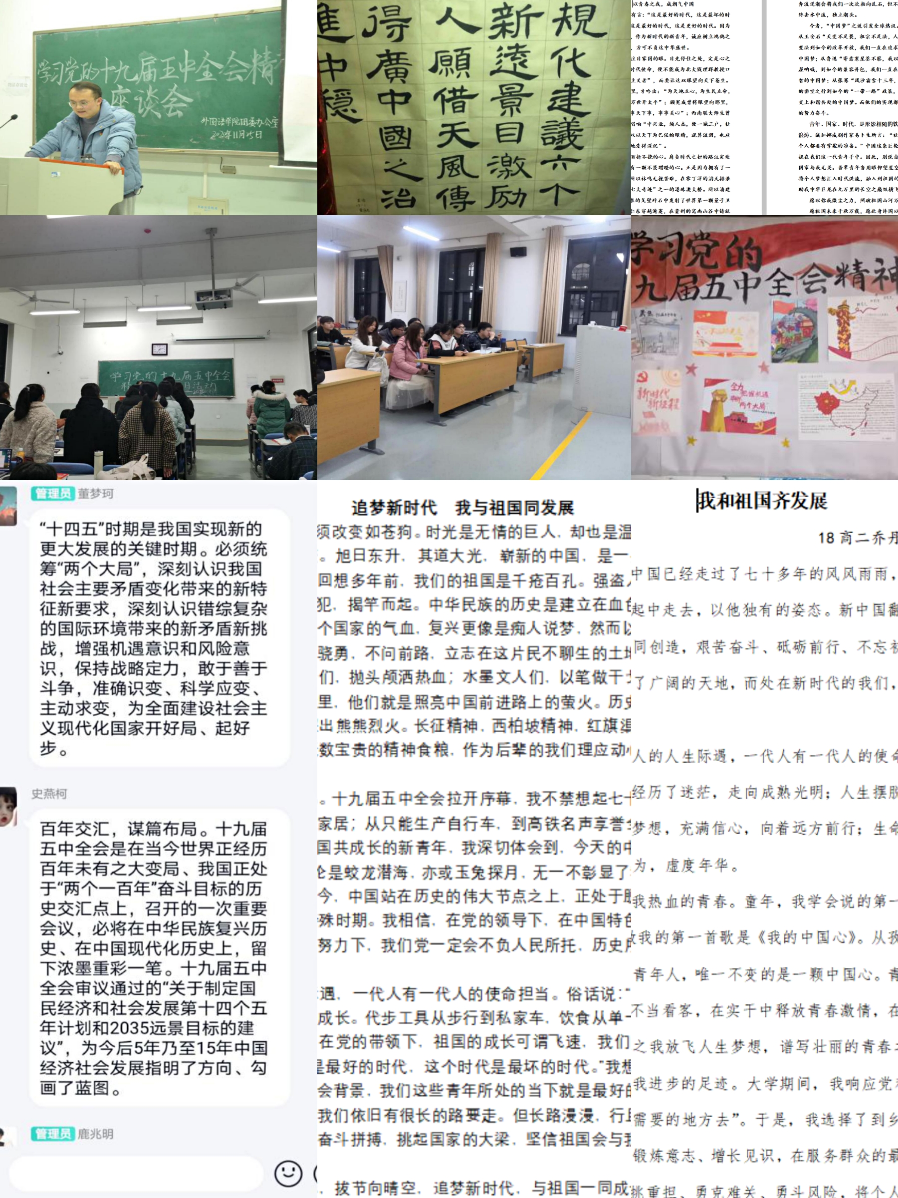 除了在各支部开展主题团日活动外,性爱网亦邀请优秀党员代表开展“学习党的十九届五中全会精神”座谈会。会上,性爱网17级优秀党员代表武文浩与大家分享学习党的十九届五中全会精神的感悟。并与同学们互动交流,耐心为同学们解答困惑。此外,性爱网还积极开展多种形式的作品征集活动,并对优秀作品进行展板展示,让同学们在实践中践行全会精神。