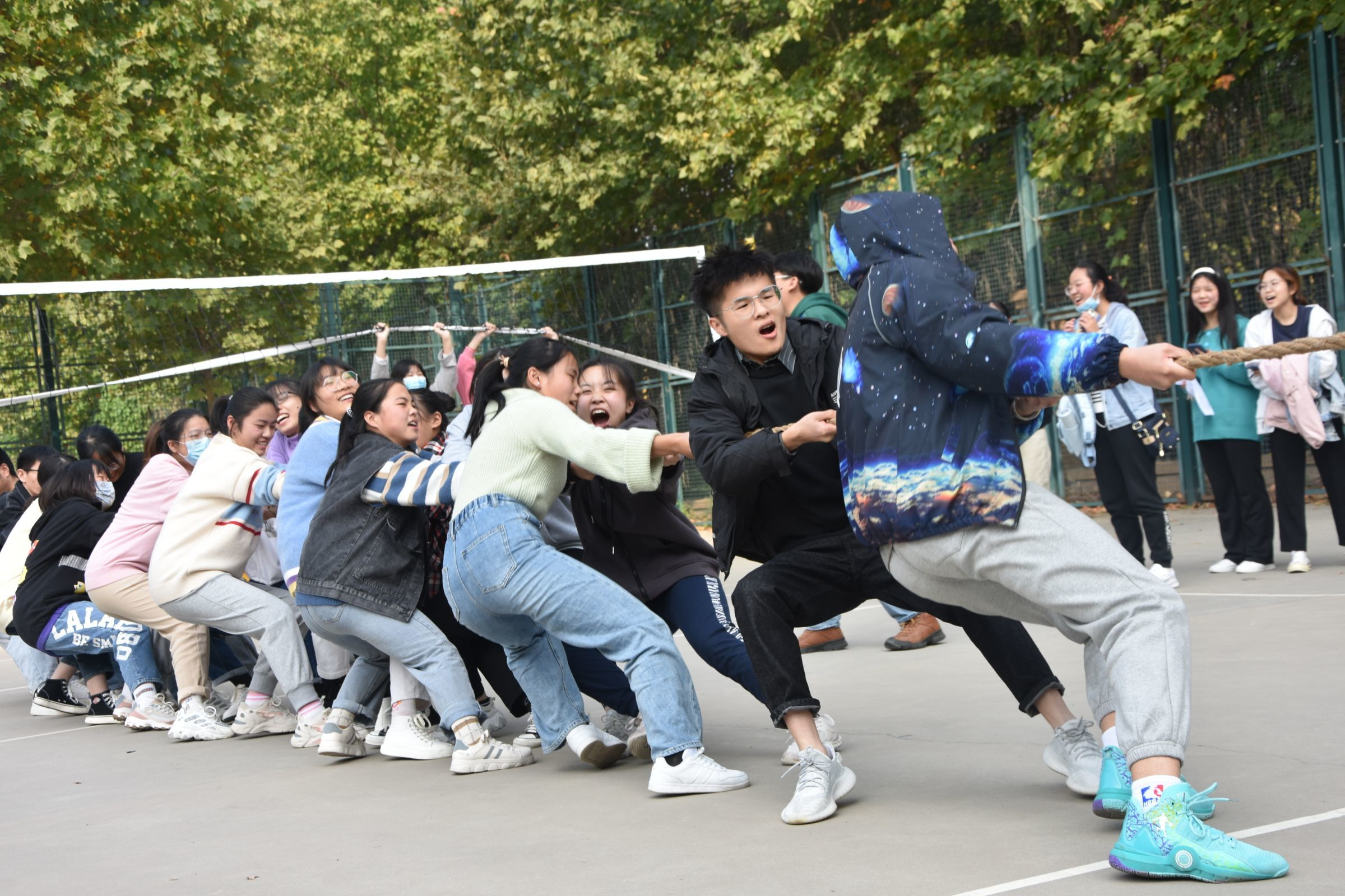 本次比赛采用淘汰晋级赛制,分为3个小组同时进行。各队伍抽签决定比赛顺序。赛前,各支队伍准备充分,信心满满的商量战术与策略,交叉排列,压低重心,共同发力。经过第一轮的淘汰赛后,共有三个班级挺进决赛,与研究生队伍进行新一轮对抗。决赛现场,随着裁判一声哨响,比赛正式开始。双方队员紧握绳子,身体后仰,使劲浑身解数向后拉拽。他们有的咬紧牙关,面红耳赤;有的胳膊颤抖,青筋暴起。为了赢得最后的胜利,各队队员齐心协力,全力配合,他们喊着嘹亮的口号,动作整齐划一。现场气氛十分火爆,观众和啦啦队自发为决赛队伍加油打气,欢呼声、喝彩声、鼓掌声阵阵袭来,愈演愈烈,飘荡在整个排球场上空。