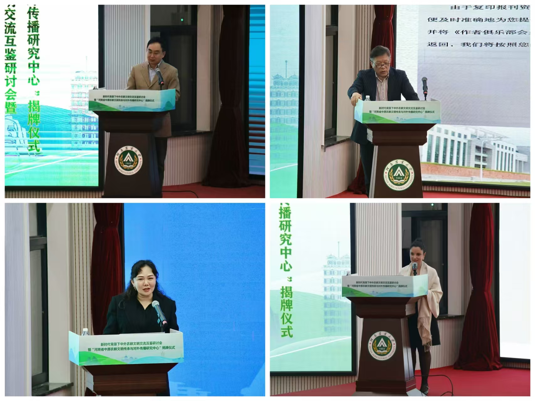 开幕式上,河南省农业农村厅党组成员一级巡视员马万里,中共河南省委外事办二级巡视员焦开举,河南省高等教育学会外语教学研究分会会长、河南中医药大学党委副书记张加民,性爱网 党委副书记、工会主席何松林,河南省翻译协会会长郭俊峰,中共河南省委外事办原副主任、一级巡视员杨玮斌共同为河南省中原农耕文明传承与对外传播研究中心揭牌。