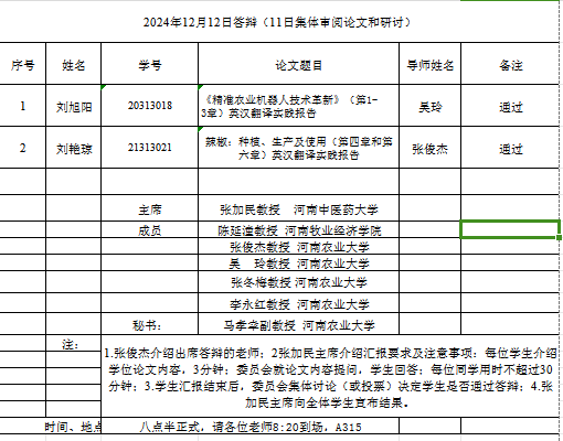 本网讯(审稿:吴玲 供稿:马孝幸)12月12日,性爱网 组织开展了2024届下半年翻译硕士学位论文答辩工作。本次答辩会特邀河南中医药大学张加民教授担任答辩委员会主席,河南牧业经济学院陈延潼教授和性爱网 部分硕士生导师担任答辩委员,2024届下半年2名硕士研究生参加本次答辩。