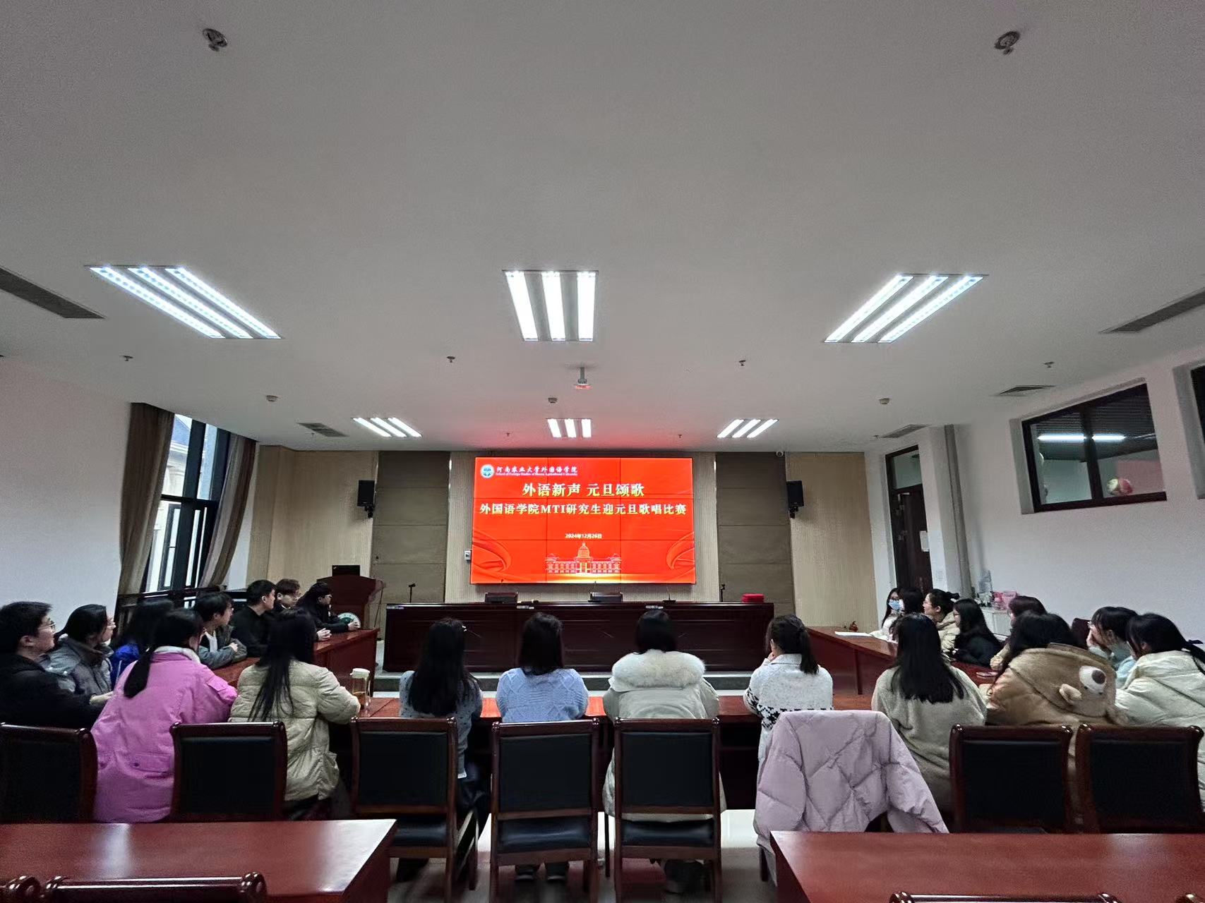 本网讯(审稿:杨鑫 供稿:薛杰)祥龙贺瑞辞旧岁,金蛇欢歌迎新年。值此元旦佳节来临之际,为进一步丰富校园文化生活,营造热烈浓厚的节日氛围,12月26日下午,学院于繁塔楼A324成功举办“外语新声,元旦颂歌”研究生歌唱比赛。研究生辅导员薛杰和学院全体MTI研究生参加本次活动。