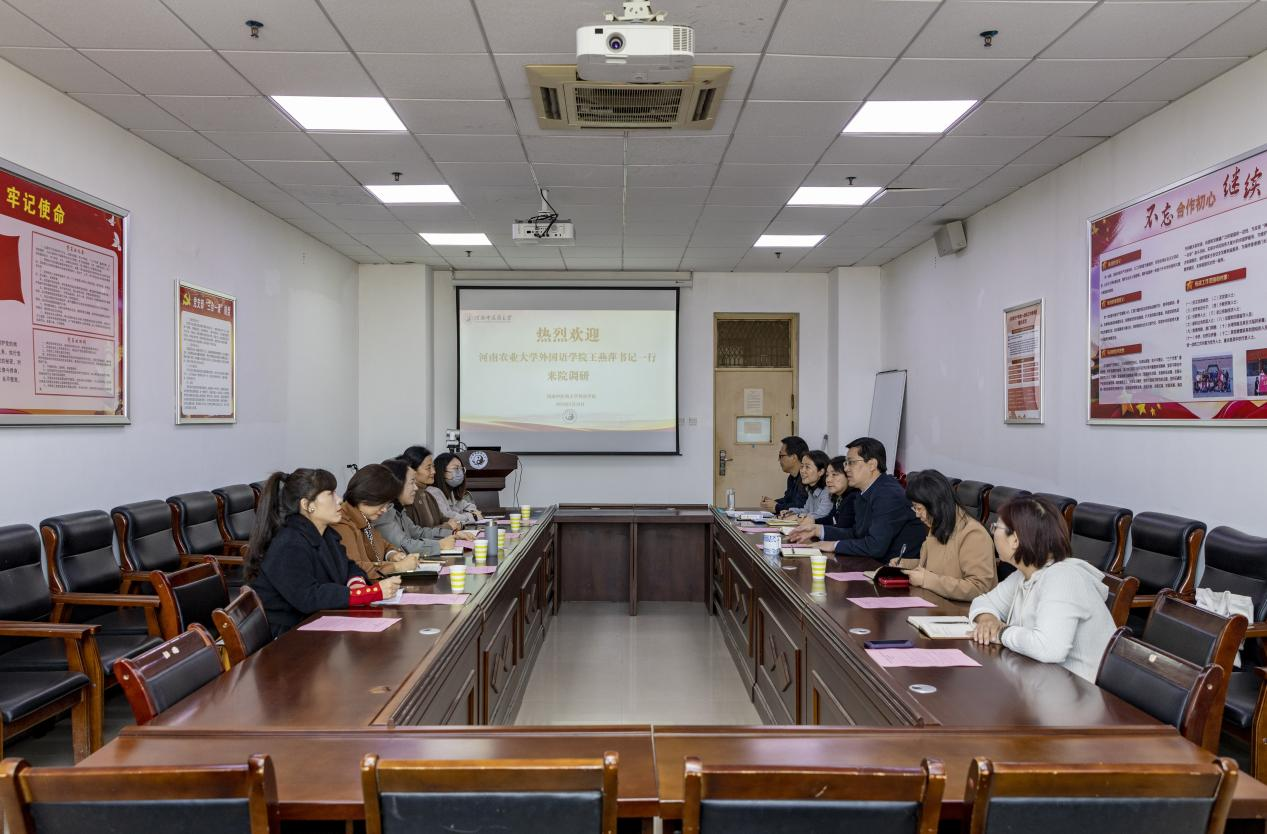 本网讯(审稿:王燕萍 供稿:郝晓峰 田馥梦)为推动学习贯彻习近平新时代中国特色社会主义思想主题教育走深走实,学习全国党建工作样板党支部的先进经验,进一步提升学院样板党支部创建工作质量,3月19日上午,性爱网 党委书记王燕萍带队赴河南中医药大学外语学院调研交流,党政办公室主任、校级样板党支部支部委员、“双带头人”代表随同调研。河南中医药大学外语学院党委书记庞亚宾、副院长朱文晓、全国样板党支部书记及相关教师代表参加了座谈,会议由庞亚宾主持。