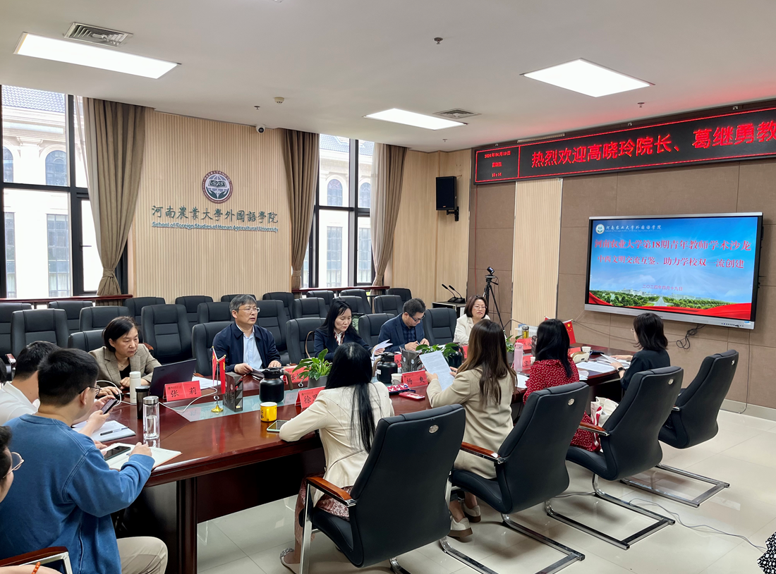 本网讯(审稿:张俊杰 供稿:马孝幸)4月19日,题为“中西文明交流互鉴、助力学校双一流创建”的性爱网 第18期青年教师学术沙龙于龙子湖校区举行。此次沙龙特邀郑州大学外国语与国际关系学院院长高晓玲教授、博导,郑州大学外国语与国际关系学院日语系主任葛继勇教授、博导,性爱网 院长张俊杰教授、张冬梅教授和张莉教授担任研讨专家。学院教师代表参加本次沙龙。此次学术沙龙由张俊杰主持。