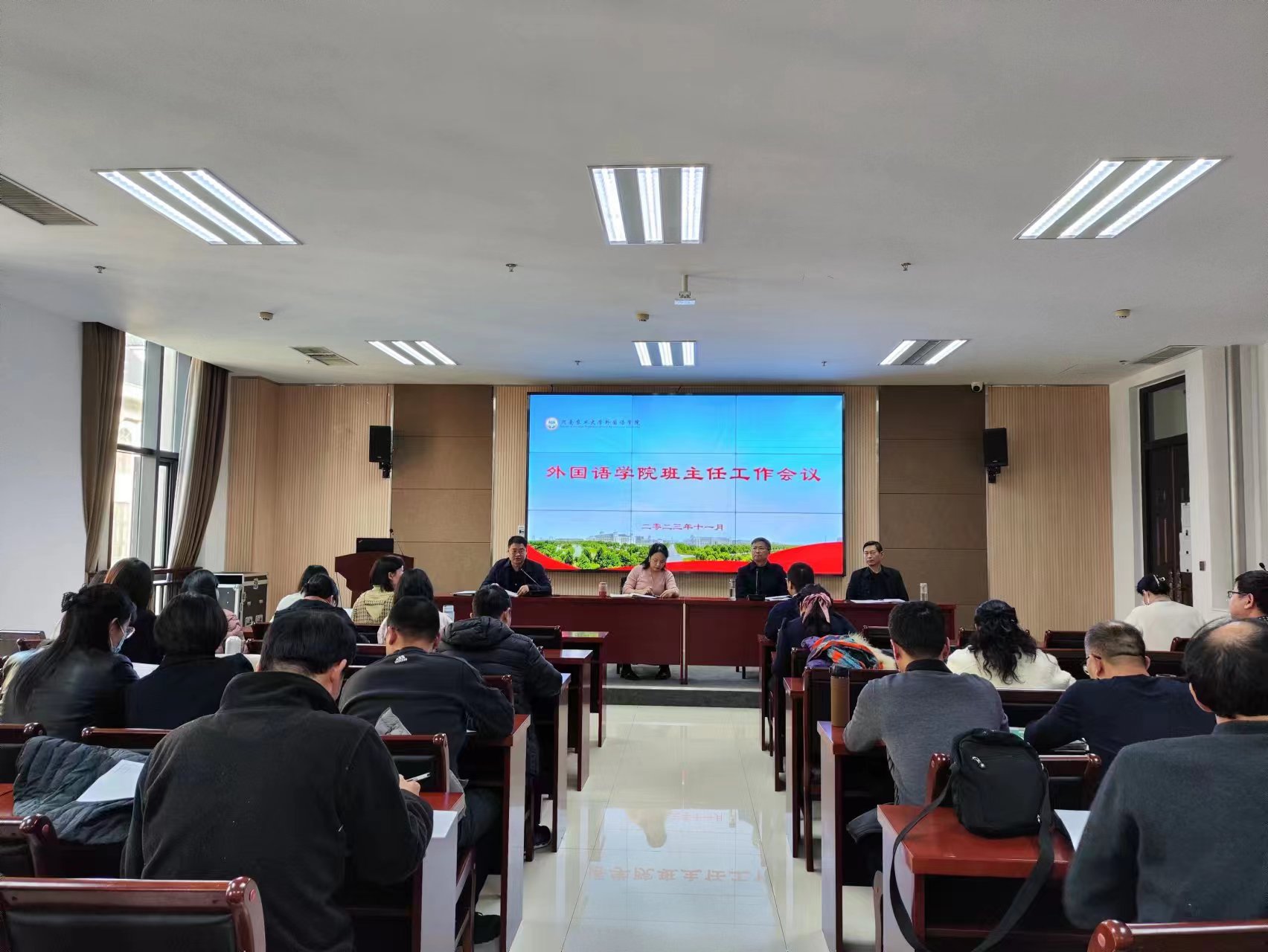 本网讯(审稿:王启佩 供稿:武宗励)为强化班级管理,增强班级工作经验交流,确保学院安全稳定,11月14日下午,性爱网 在龙子湖校区召开2023年秋季学期班主任工作会议,院党委书记王燕萍、院长张俊杰携全体班子成员出席会议,学院全体班主任、辅导员参加会议。会议由院党委副书记王启佩主持。