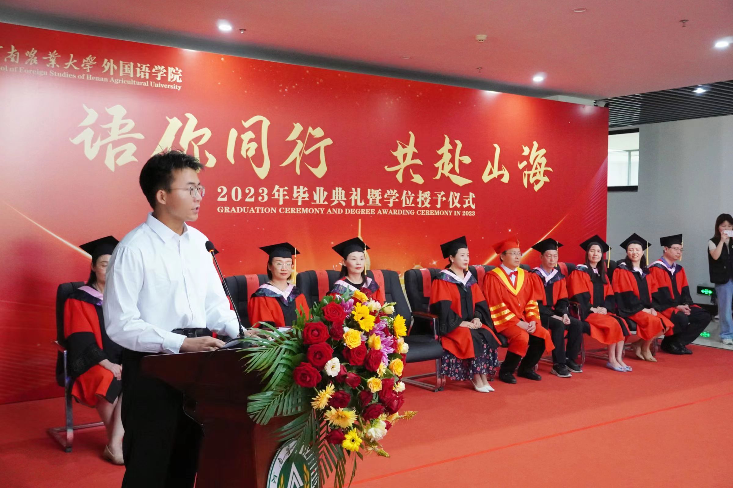 研究生毕业生代表21级MTI向婧仪、本科毕业生代表2019级英语一班陈甜甜、在校生代表2021级翻译一班李珑煊依次上台发言。回顾了大学生活的点点滴滴,表达了对学校、老师的感恩之情,并表示将不忘初心,努力奋斗,回报母校,回报社会。日语系杨华教授,代表全体教师祝愿毕业生们永葆纯真与热情,前程似锦。