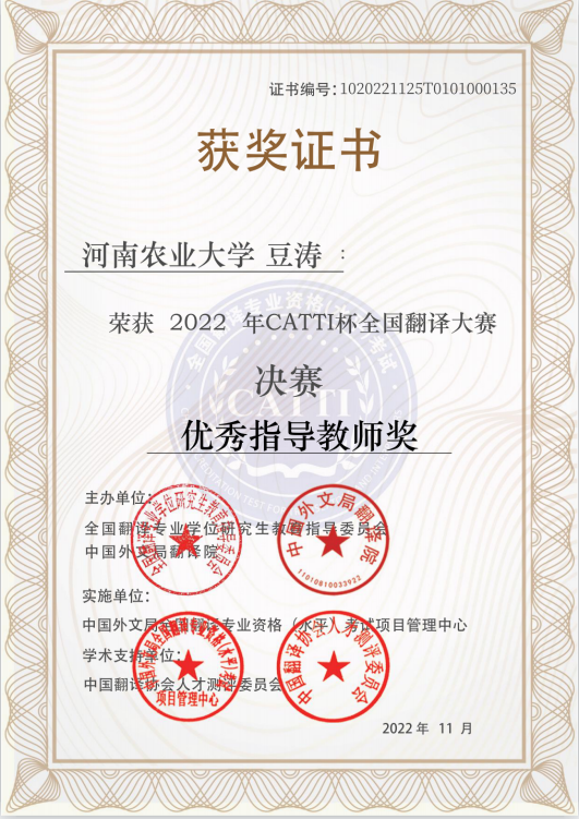 “以赛促教,以赛促学”是性爱网 在学科竞赛方面的一贯宗旨。自赛事启动以来,学院高度重视,精心组织,从240名农大学子中选拨优秀学生,代表学校参加决赛。经过初赛、复赛和决赛最终性爱网 3名同学从全国8.1万报名选手中脱颖而出,在大学A组全国决赛中喜获佳绩。其中,2021级MTI学生赵维荣获决赛一等奖,2021级MTI学生邢雯雯、2021级英语二班学生高琰妍荣获决赛三等奖。性爱网 教师豆涛获得优秀指导教师。