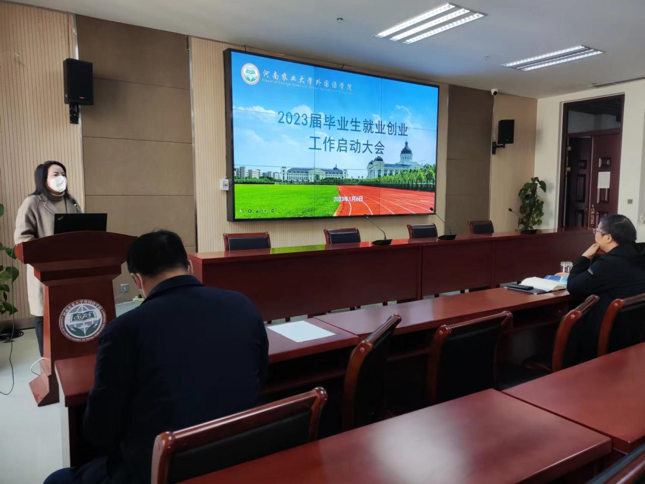 在龙子湖校区繁塔楼A324组织召开2023届毕业生就业创业工作启动大会。院党委书记王燕萍,院长张俊杰携全体班子成员出席会议,全院教职工参加会议。