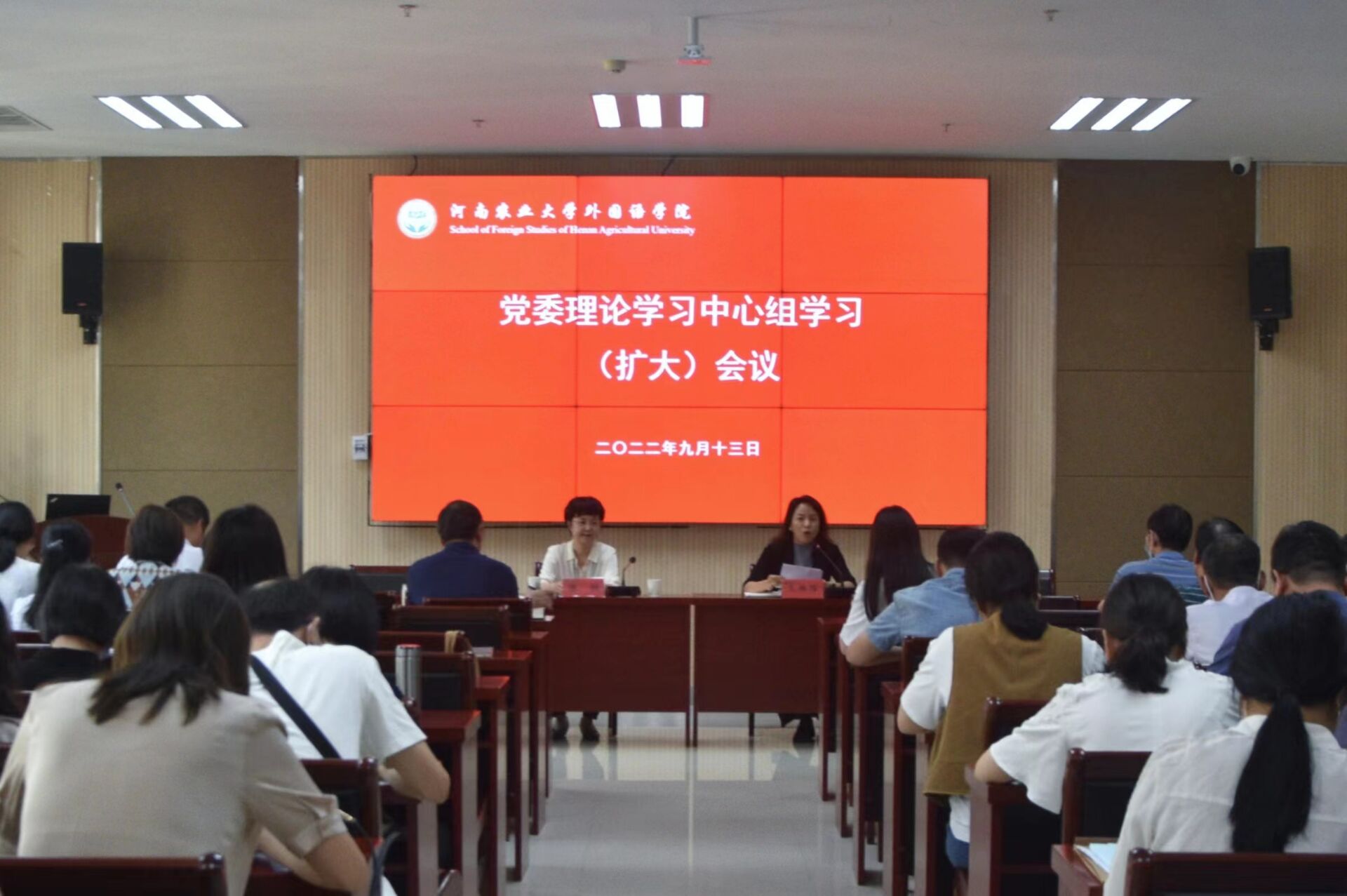 9月13日下午召开党委理论学习中心组学习(扩大)会议,特邀马克思主义学院教授陈娱讲授《习近平新时代中国特色社会主义思想的新境界、新飞跃》,对《习近平谈治国理政》第四卷进行重点学习。学院党委书记王燕萍、院长张俊杰、院领导班子成员,全体教职工参加学习。