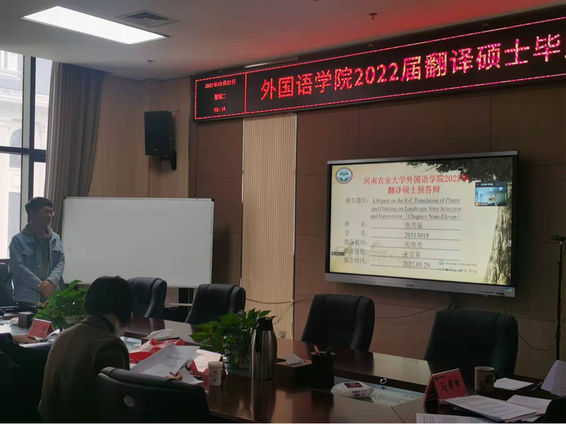 在繁塔楼A320、A324并结合线上会议形式,开展了2022届翻译硕士研究生毕业论文预答辩。此次预答辩邀请了郑州大学教授王志伟、河南师范大学教授赵文静、河南大学教授杨朝军分别担任答辩主席,全体翻译硕士研究生导师和2020级翻译硕士研究生参加预答辩,2021级研究生参加旁听。