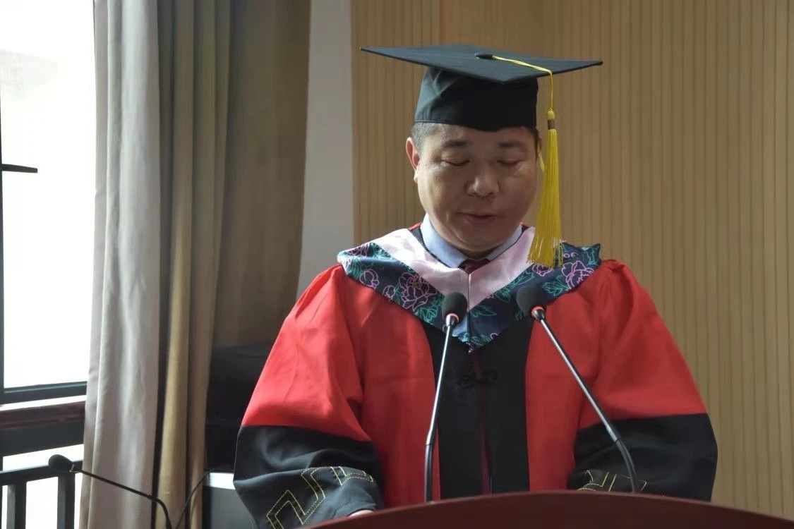 随后,毕业生代表2017级英语三班学生胡舒、在校生代表2019级日语二班张文博分别发表讲话。教师代表赵凤玲发表讲话,她寄语广大学子不要抛弃学问,不可自鸣得意,不可轻言放弃,明确目标规划,拥有靓丽坦途。接着,院长张俊杰致辞。幽默风趣又饱含离别之殇的致辞获得了同学们的阵阵掌声。他勉励同学们心存善念、心怀感恩、坚守本心,做一个对国家和社会有奉献的人;勿以善小而不为,勿以恶小而为之,在不断的学习中做好每一件事;一往无前、奋力拼搏,面对坎坷与磨难时客观冷静、自信坚强。同时引经据典,鼓励即将步入社会的毕业生们树立终身学习的理念,满怀豪情壮志和时代使命,唱响青春之歌,走好人生花路,找寻属于自己的阳春白雪、万水千山。