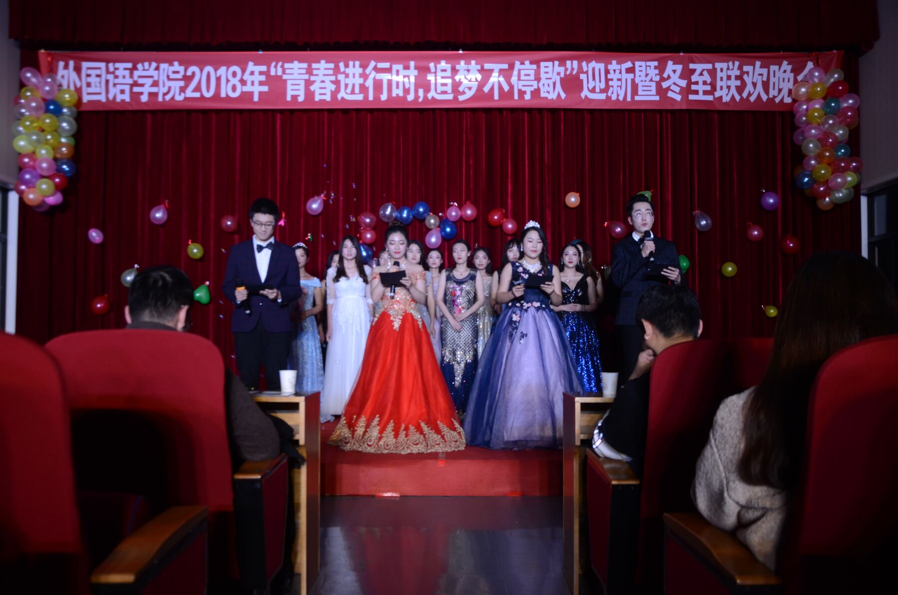 学子青春风采,丰富学院文化生活,12月20日晚七点,学院在龙子湖校区繁塔楼大教室一举办了一场以“青春进行时,追梦不停歇”为主题的2018年迎新暨冬至联欢晚会。院党委副书记周晓、团委书记李沛、辅导员王颖和英语系教师朱婧出席本次晚会,学生会、社管会联合院艺术团共同承办了此次晚会。