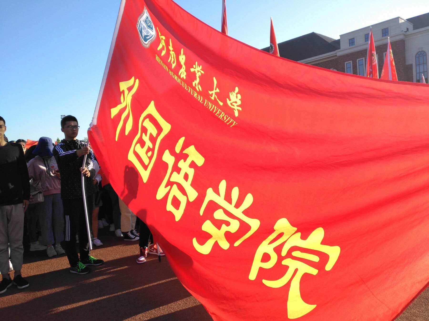 龙子湖校区田径场参加升旗仪式,喜迎国庆节的到来。