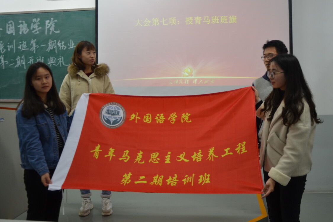 青马班实施方案》,详尽地为与会学生解读青年马克思主义培训班的培养目的、培养内容、课程设置、队伍建设、培养要求等内容。青马班第二期学员代表闫雪茹表示自己将会努力认真学习马克思主义,担负起青年责任,做到“身在校园,心系国家”,严格遵守青马班的规章制度,为做一名合格的马克思主义者而奋斗。当鲜艳的团旗从第一期学员传递到第二期学员的手中,全场肃静无声,这是信仰的过渡,更是马克思主义思想的传承。随后,宣誓人刘梦凯带领青马班全体学员进行宣誓,在激昂的宣誓声中青马班学员更加坚定了为共产主义奋斗的信念。