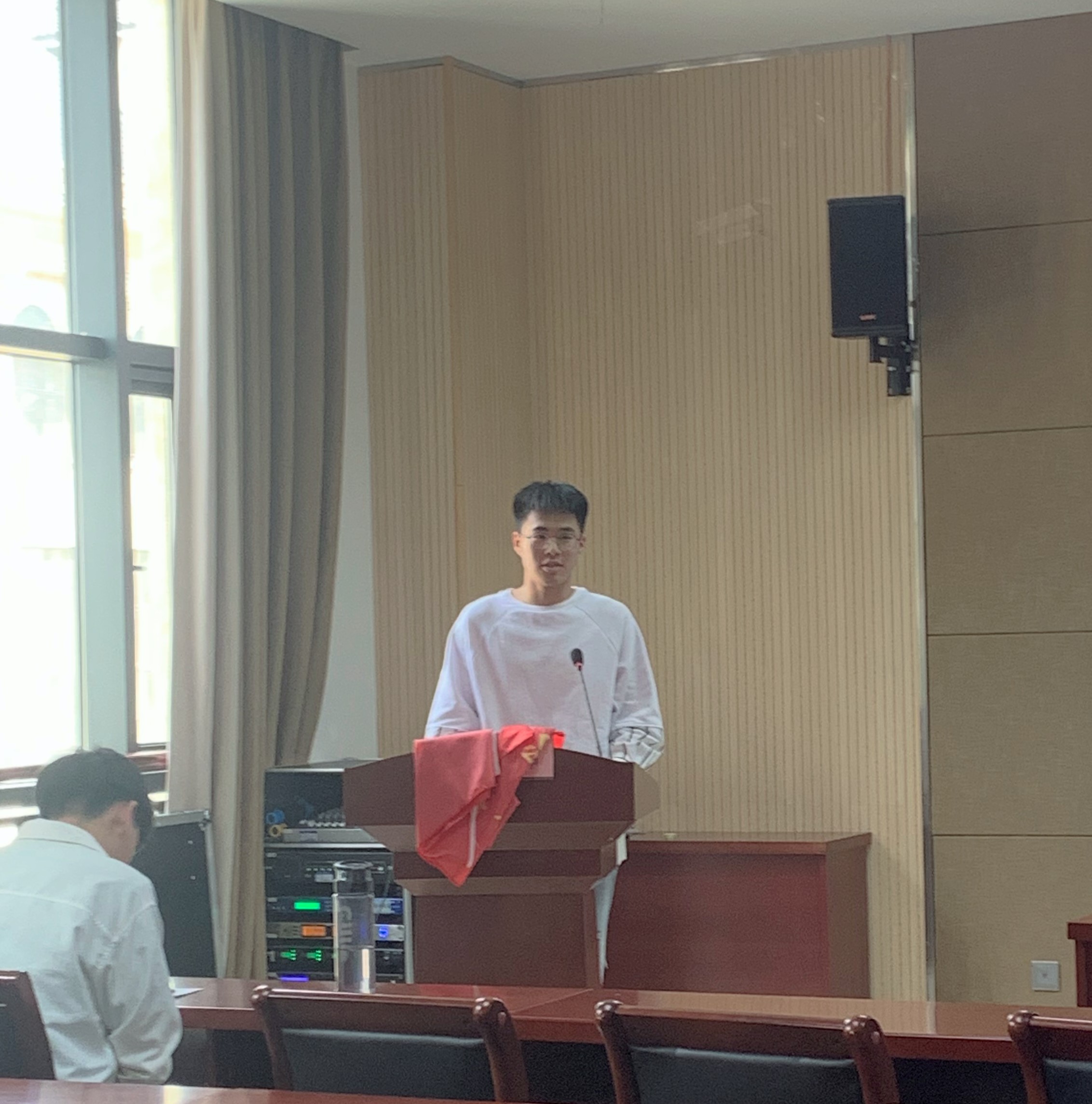 随后,邓振营为第四期青马班学员授旗并发表讲话,首先,他对第三期学员们顺利结业表示了祝贺并对第四期学员的到来表示了热烈的欢迎。同时他结合自身党史学习经验和心得体会,通过回顾党的光辉历史,讴歌党的丰功伟绩给大家上了一堂生动的思政课,并勉励同学们学党史、悟真理、担使命。同时,他向同学们提出了三点期望:明确学习目标,坚定“四个自信”;坚定理想信念、提高理论素养,树立远大理想、以青年马克思主义者的标准衡量自己;勤奋学习,知行合一,争当先锋模范,乐于奉献社会。最后,陈桃进行了总结并宣布此次仪式圆满结束。