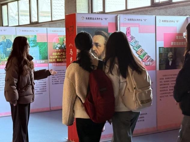 马克思主义学院讲解员在导览中特别强调:"马克思主义不仅是认识世界的工具,更是改造世界的方法论。青年应掌握其立场、观点与方法,在实践中坚定信仰。"在铿锵有力的文字中,大家深刻体会到马克思主义在中国落地生根的历史必然性,并纷纷表示:“展览让我更直观地理解了‘马克思主义为什么行’。尤其是‘实践是检验真理的唯一标准’这一观点,激励我们在实践中贡献青春力量。”