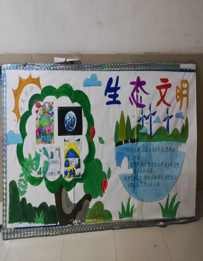 在活动期间,同学们便投入到紧张而兴奋的创作中。有的同学聚精会神地在纸上勾勒出精美的图案,用细腻的笔触描绘出蓝天、碧水、青山等自然元素,展现出对生态文明的美好向往;有的同学则专注地书写着文字内容,从生态文明的定义、重要性到如何在日常生活中践行环保理念,他们用简洁明了、生动有趣的话语传递着自己的理解;还有的同学将绘画与文字巧妙结合,创作出一幅幅内容丰富、形式多样的手抄报。使更多的同学们感受到了保护生态的磅礴力量。