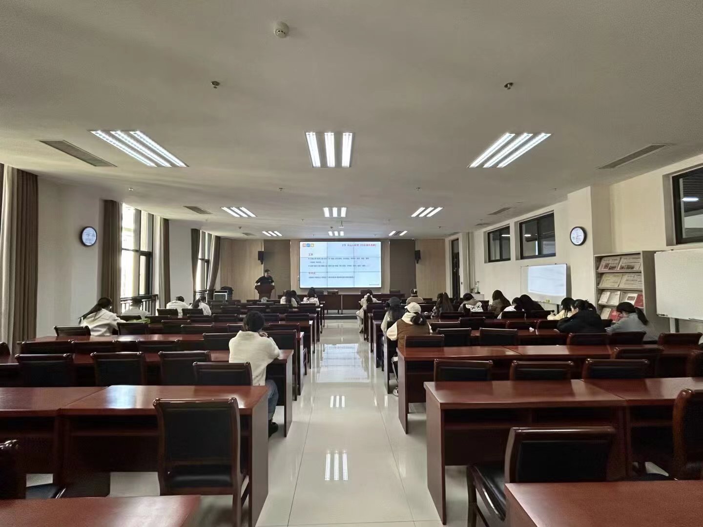 会议伊始,张军向同学们详细介绍了企业旗下项目、办学特色、教育理念、薪资待遇、人才发展等情况,并就校招 计划、校招岗位、校招流程等做了详尽解读。在答疑环节,同学们就公司的发展规划、入职条件等方面积极进行提问,主讲人就各个问题做了多角度、全方位的解答,会议现场氛围轻松活跃。