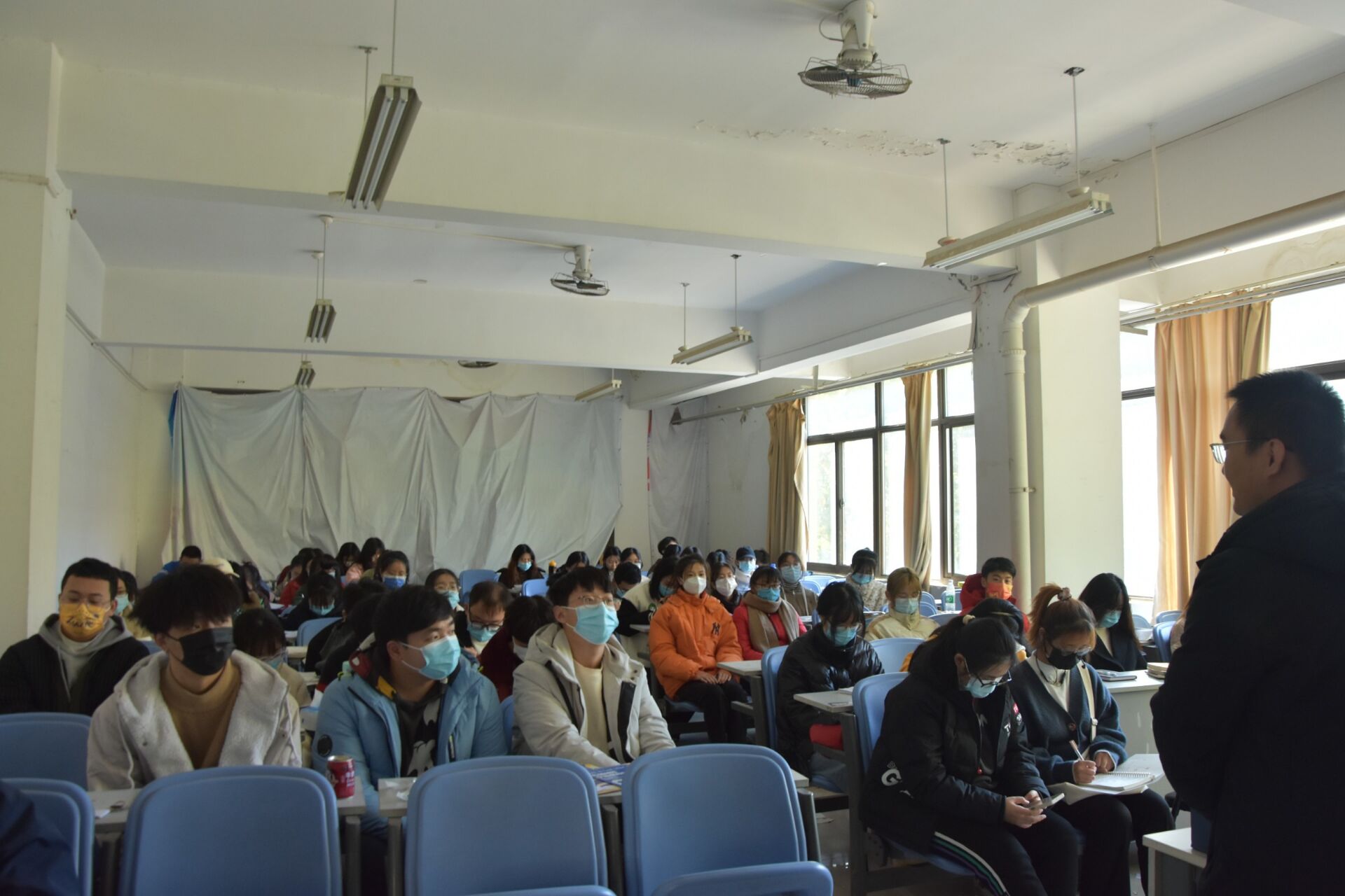 随后,三位老师总结说明近期的疫情防控和安全防范工作。他们强调疫情防控是头等大事,要求同学们遵守校规校纪,全员配合学院的各项排查;同时注意健康上报的时间节点,不要漏报、晚报。此外,他们还提醒大家注意人身安全,排除安全隐患,保证宿舍用电安全,并提高防范意识,谨防近期高发的电信诈骗。