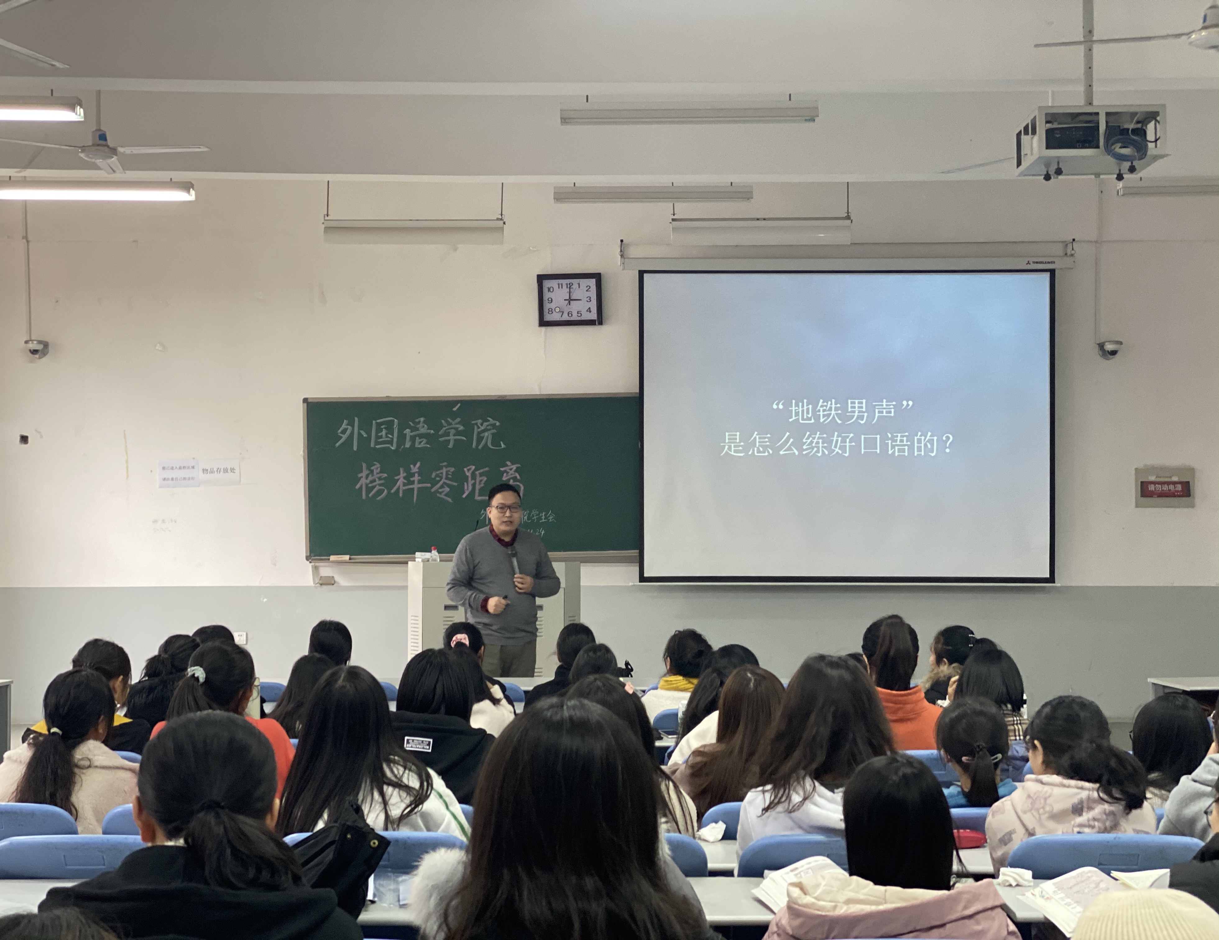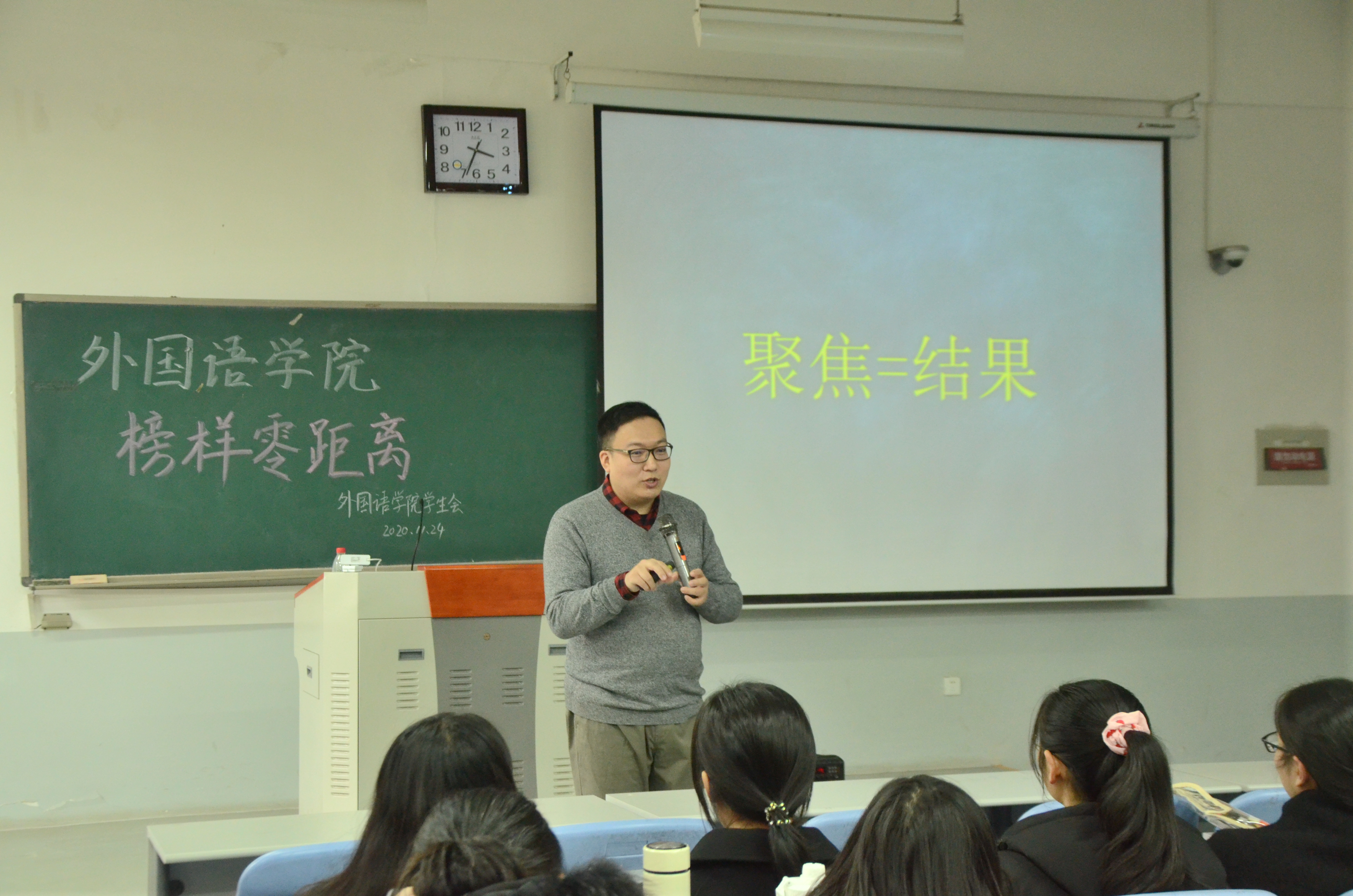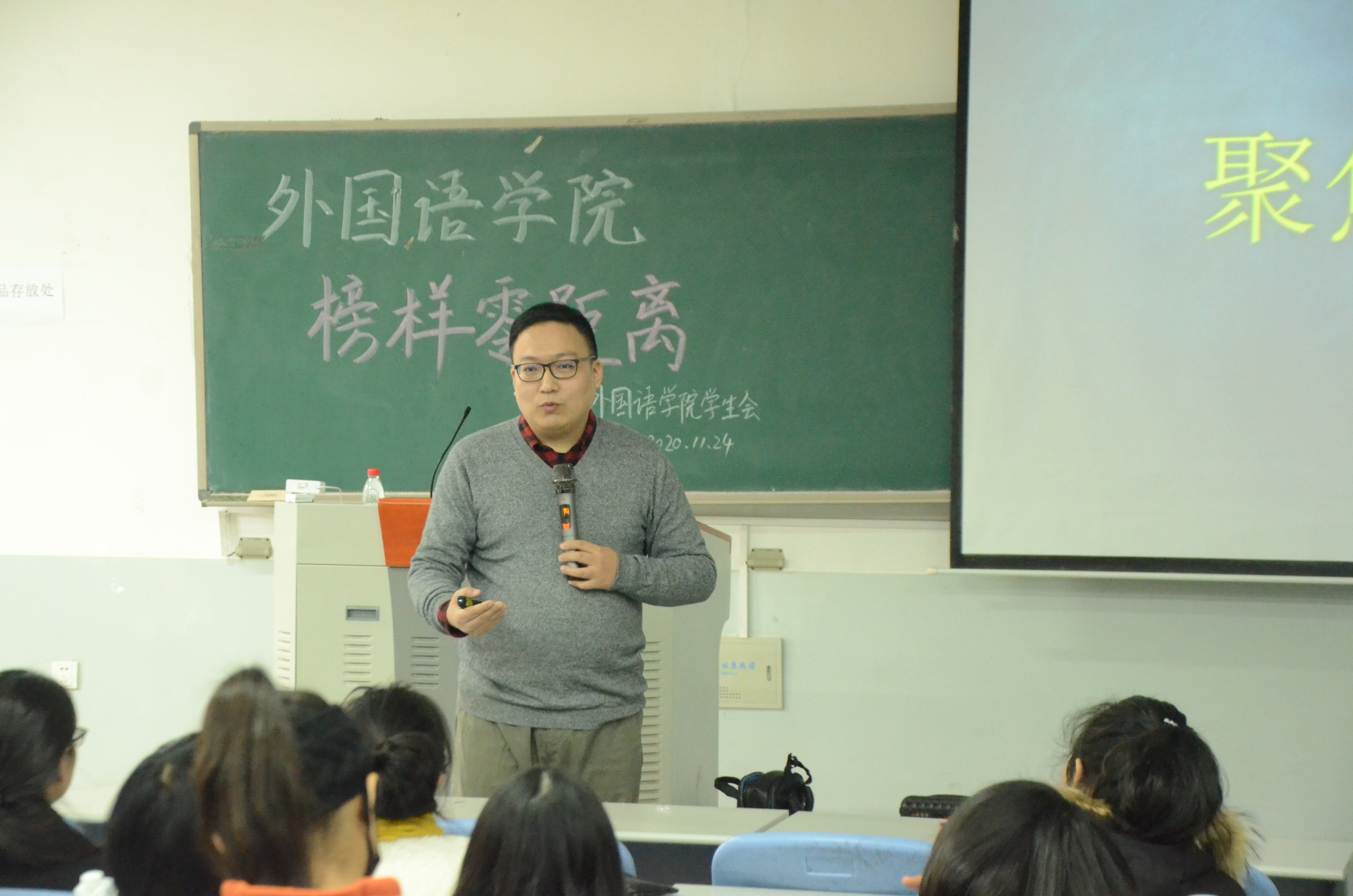 讲座伊始,杨磊从自身的经历入手,鼓励大家积极参加演讲比赛,以赛促学,以学促用,切实提高自己的口语能力;随后,针对大学生如何保持心态,他以“聚焦=结果”,向大家阐明了大学生涯中确立目标与方向的重要性,并强调了大学生自主解决问题能力的重要性;同时,他以“Exposure 、Acquisition、Interaction”三个单词生动地为大家介绍了系统的英语学习方法,赢得了学弟学妹们的阵阵掌声;讲堂接近尾声时,他寄语在场学生勇于摆脱自身“标签”,走出舒适圈,充分利用好大学的时间,不断地改变自己,提升实力,成为综合性人才。提问环节时,杨磊以幽默有趣的风格,耐心地为提问者答疑解惑。至此,此次讲堂完美落下帷幕。