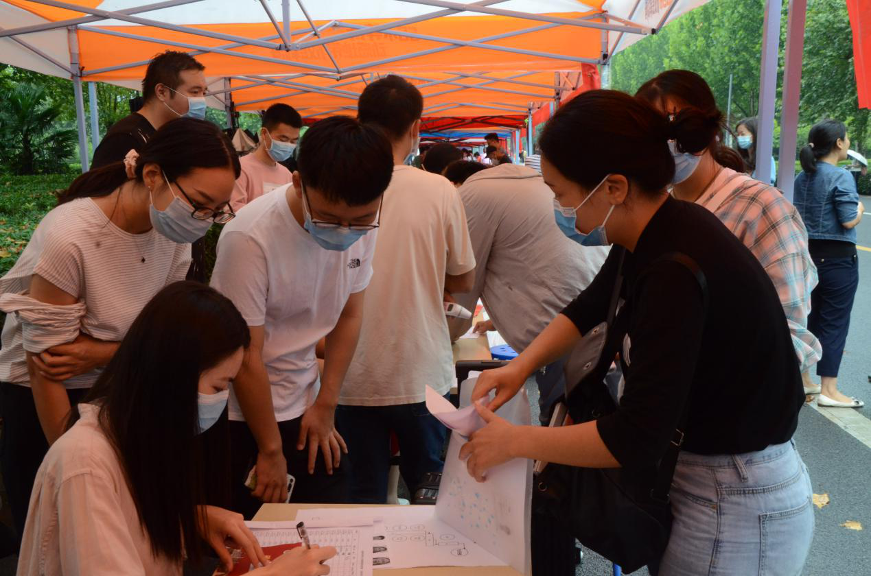 志愿者和老师们在岗位上热情细心地引导新生完成报到流程,并耐心地介绍疫情期间性爱网