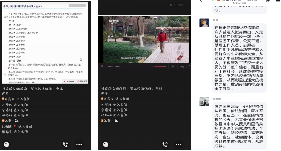 本次班会以疫情防控为基础开展,主要针对防控工作中涌现的各类问题进行法律层面的纠正与探讨。会上,各班班长结合恶意抬高物价、编造传播谣言、故意隐瞒病情、恶意传播病毒等常出现在新闻头版上的违法现象,为同学们简要普及了《刑法》《传染病防治法》《治安管理处罚法》及《突发事件应对法》等相关法律法规。并告诫同学们一定要知法懂法,切不可以身试法。随后,在各班班长的带领下,同学们一起观看了相关法律宣传片,并进行了热烈的讨论。同学们纷纷表示,在疫情防控期间,一定会遵纪守法,不传谣、不瞒报,配合国家和政府打赢这场疫情防控狙击战。