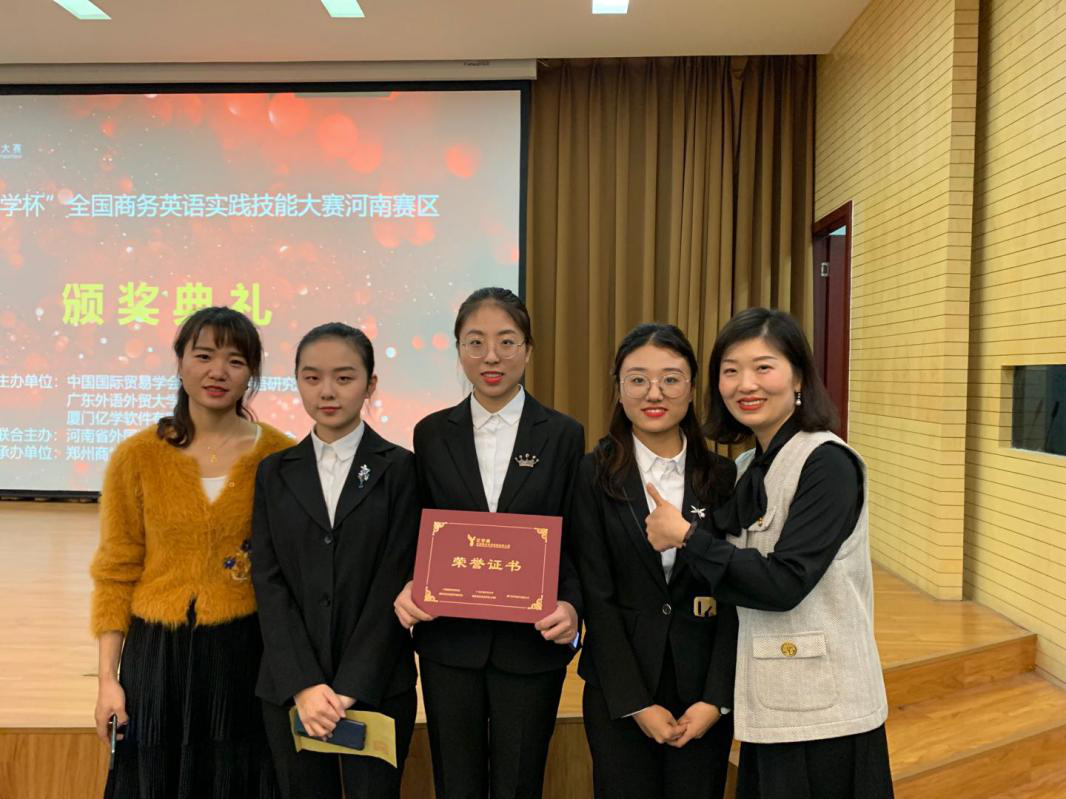 学子代雨晴、李雨欣、李歌畅组成代表队,积极参与了此次大赛。在学院老师老师柴奇、关珊珊的指导下,他们运用扎实的商务英语知识,以精彩的口语表达博得众彩、脱颖而出,经过与来自24所高校的代表队为期两天的激烈角逐,最终喜获三等奖。